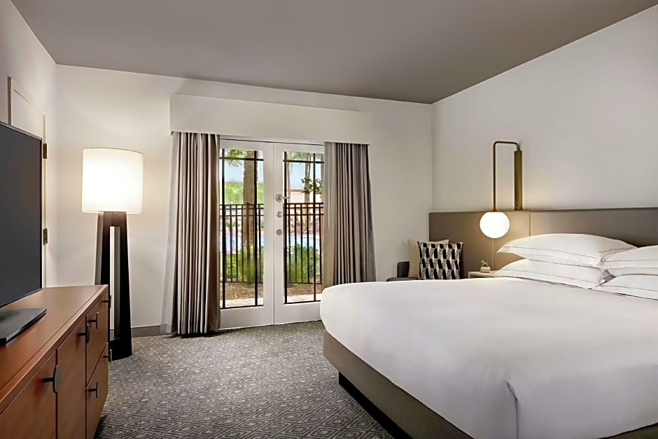 This mobility accessible standard room features one king-sized bed and an accessible tub. Any corresponding photo may not reflect the specific accessible room type or room feature.